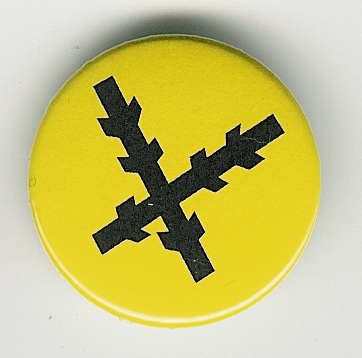 Skřížené černé ostrve (žebříky z osekaných kmenů) na žlutém pozadí.